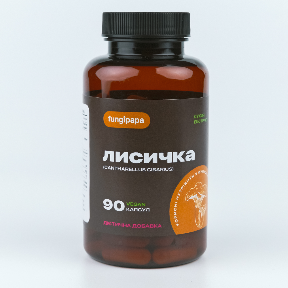 Fungipapa пропонує вам 100% натуральний екстракт гриба лисички (Cantharellus cibarius) у формі капсул. Лисички відомі своїми потужними антиоксидантними властивостями та здатністю підтримувати здоров'я організму на клітинному рівні. Завдяки сучасному методу екстракції, наш екстракт зберігає всі корисні речовини цього унікального гриба, включаючи полісахариди, бета-глюкани (20%) та інші біологічно активні сполуки.